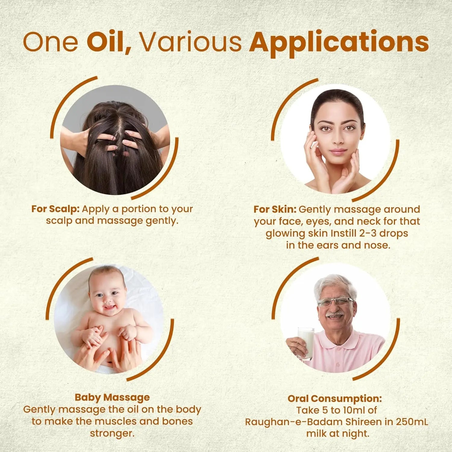 Hamdard Raughan-e-Badam Shireen is a 100% pure and natural sweet almond oil that promotes overall wellness. Extracted from premium quality almonds, it serves multiple purposes—from deeply moisturizing dry skin and nourishing hair to aiding digestion and supporting brain function when taken with warm milk. Its mild formula is suitable for adults and babies alike, making it ideal for body massages and internal use (under guidance).