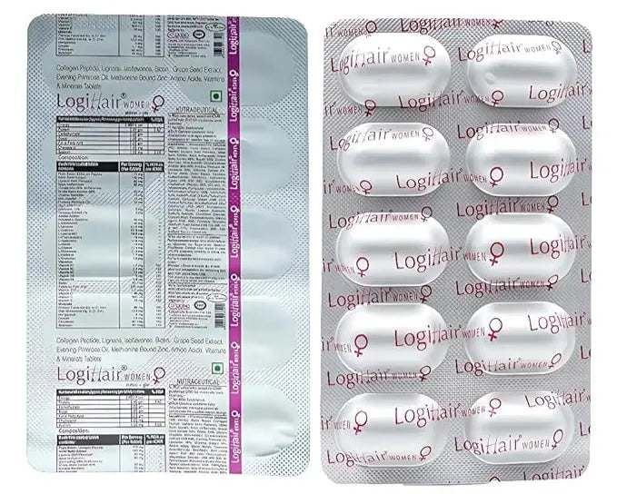 Logihair Women Tablet is a scientifically formulated dietary supplement designed to support healthy hair growth, strength, and shine in women. Enriched with a blend of essential vitamins, minerals, amino acids, and natural extracts, this supplement works from within to reduce hair fall, improve scalp health, and promote thicker, stronger strands. Ideal for daily use, it addresses nutritional deficiencies that often contribute to hair issues.