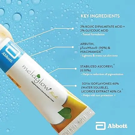 Melaglow Rich Cream 20g is a dermatologist-recommended skin brightening formula enriched with Kojic Acid Dipalmitate, Arbutin, Liquorice Extract, and Vitamin C. Specially designed to reduce hyperpigmentation, dark spots, and uneven skin tone, it enhances the natural glow and radiance of your skin. Ideal for all skin types, it helps in achieving visibly brighter and healthier-looking skin with regular use.